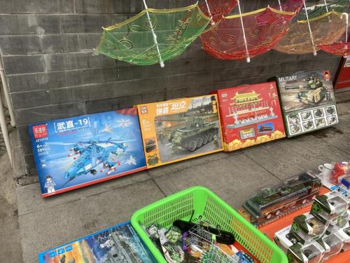 Et dans la petite ville, le long de la rue principale, un petit étal extrêmement flippant… des imitations de Lego militaristes : chars, hélicoptères de combats, vaisseaux de guerre, … En n’y prêtant pas trop attention même le logo fait penser à celui de Lego. Sur le même étal de jeux d’enfants, des reproductions (je l’espère !) de pistolets Mauser C96 utilisés par les troupes chinoises, plus vraies que nature.
