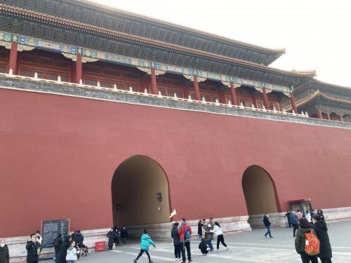 L’entrée en elle-même comprend 5 portes : la plus grande (celle du milieu) uniquement pour l’empereur avec sur la porte 9 rangée de 11 « clous » (voir article sur les superstitions). A gauche et à droite de celle-ci, les deux portes pour la famille impériale et pour les hauts dignitaires puis les portes sur le côté pour les « petites gens » (pas si « petites gens » que ça car ils ont quand même accès au palais… On ne parle pas du peuple là !). La couleur dominante est le rouge avec des toits dorés (voir symbolique des couleurs dans un autre petit article).